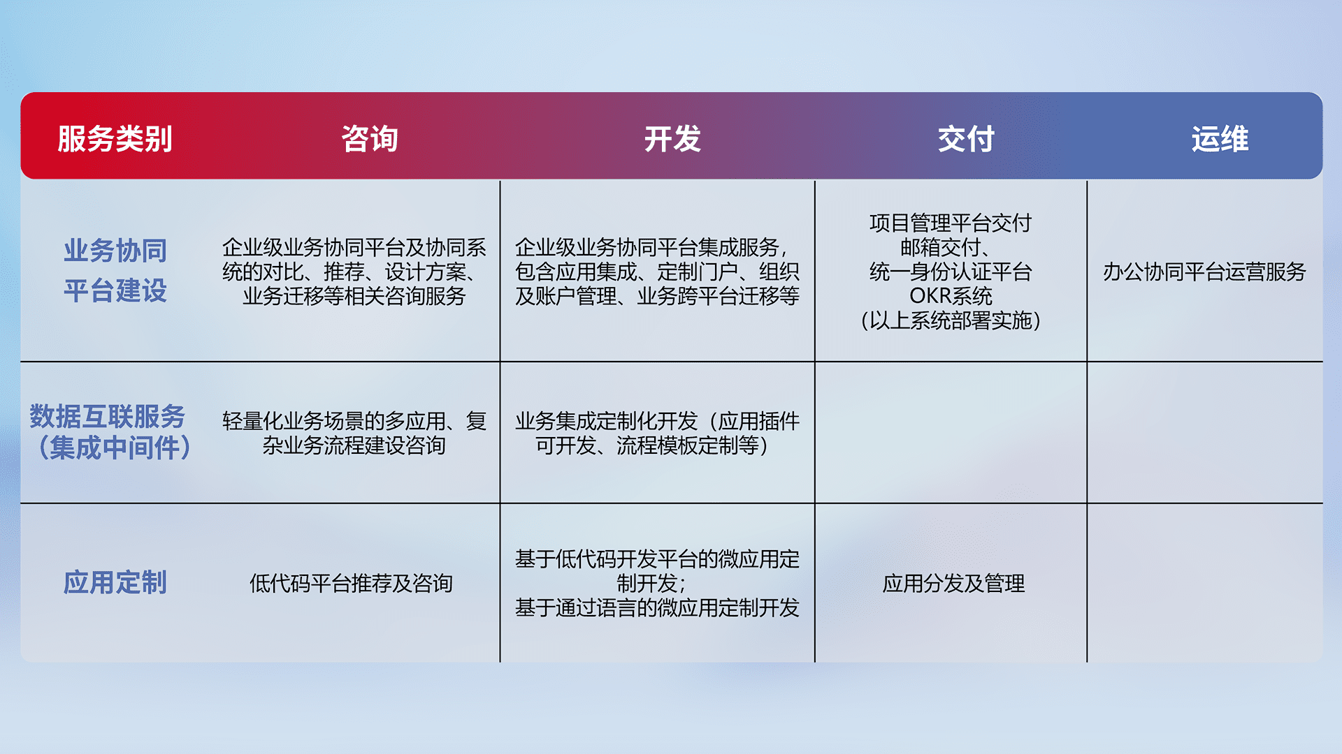 针对钉钉、、、企微、、、IDaas等平台级产品提供产品的规划、、、、方案、、交付、、、定制化开发等服务,,实现如统一协同办公、、、智能客户服务、、、、混合会议管理、、智能数据查询、、等业务场景,,实现数字化转型。。
